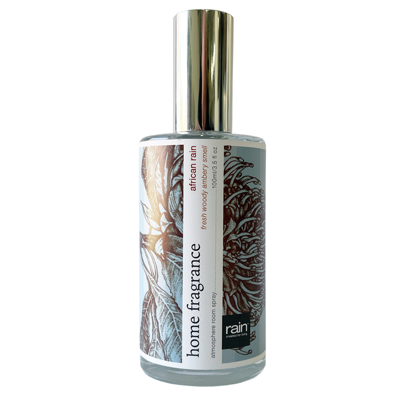 African Rain Room Spray will take you on a trip to the southernmost tip of Africa with its subtle fragrance of lemon, mandarin, freesia and moss. This fresh room spray is not pressurized and does not contain CFC’s which are harmful to the environment. We can honestly say that our mist is "Ozone Friendly". Because it is not bottled under pressure – you also get a lot more liquid and it lasts and lasts .. and lasts.