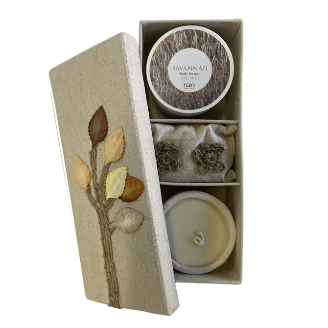 This gift box contains a rich and nourishing body butter in our signature Savannah fragrance, a scented candle and scented sachet.