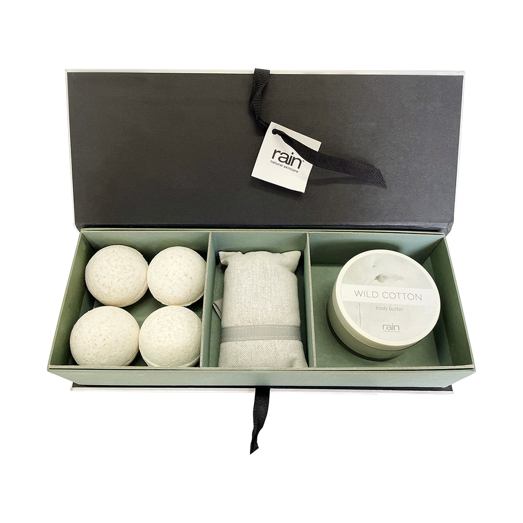 Handcrafted with love, this box set contains four fizz balls, a scented sachet, and a 100 ml Wild Cotton Body Butter.