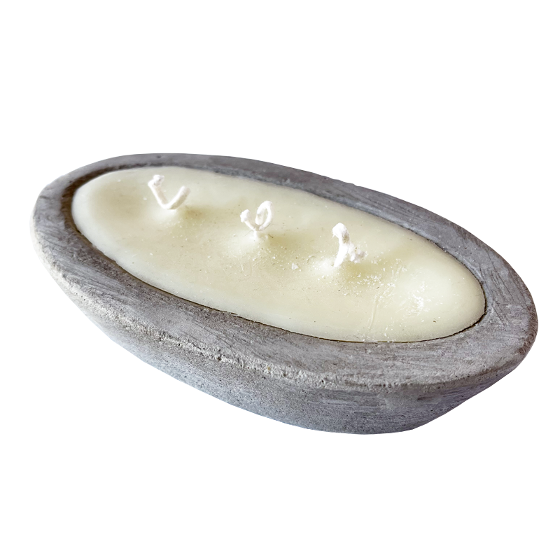 Handmade ivory, oval shaped candle bowl, made from quarried sand and a binding medium. Approximate size 45mmx 180mm with multi-wick lemongrass candle.