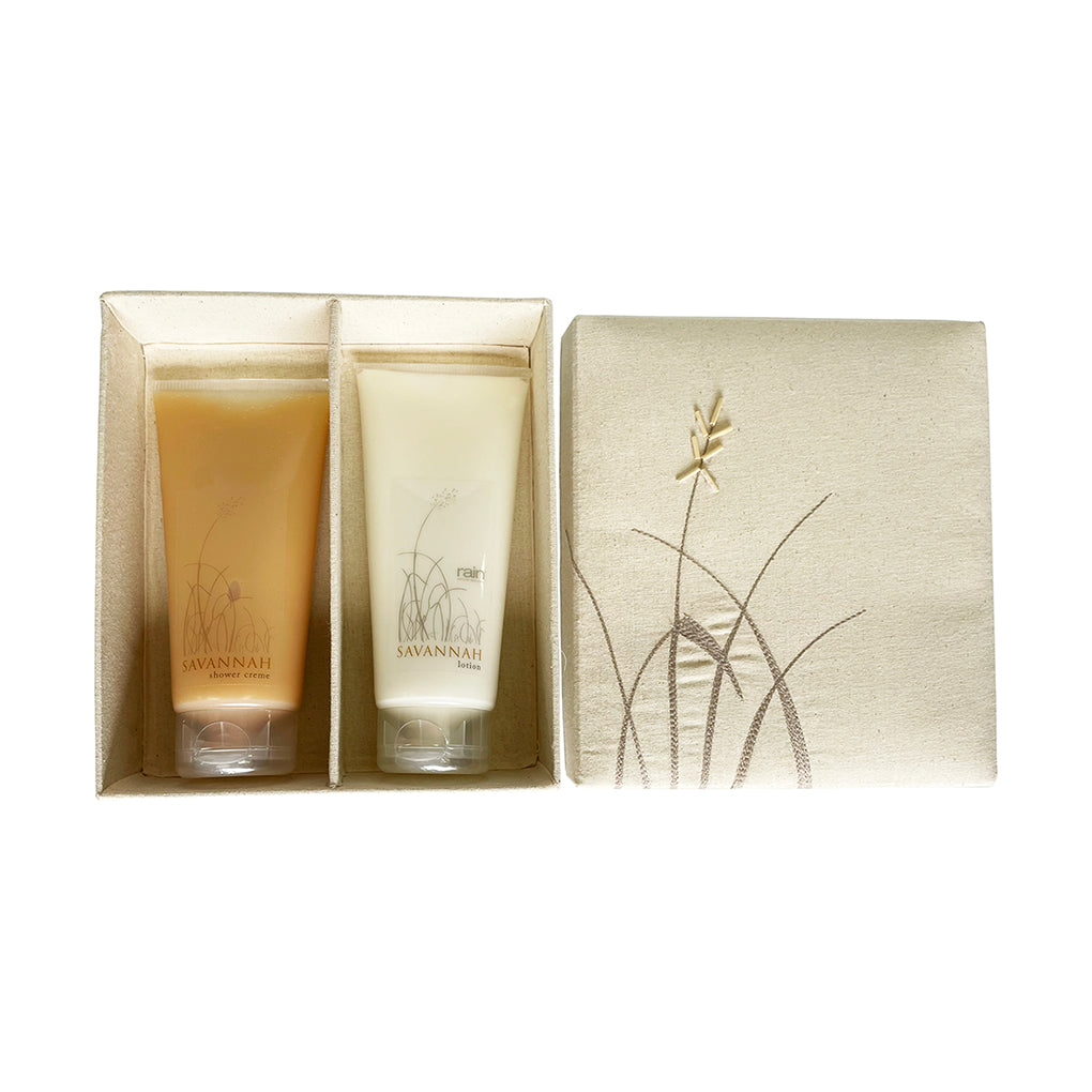 A unique handmade, hand embroidered linen box containing a Savannah Shower Creme and Savannah Hand & Body Lotion in convenient, travel-friendly tubes.